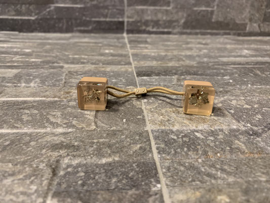 Die Metallbeschläge sind leicht oxidiert und weisen hier und da mehr Kratzer auf. Das Schloss weist zudem silbern geriebene Stellen auf.