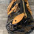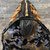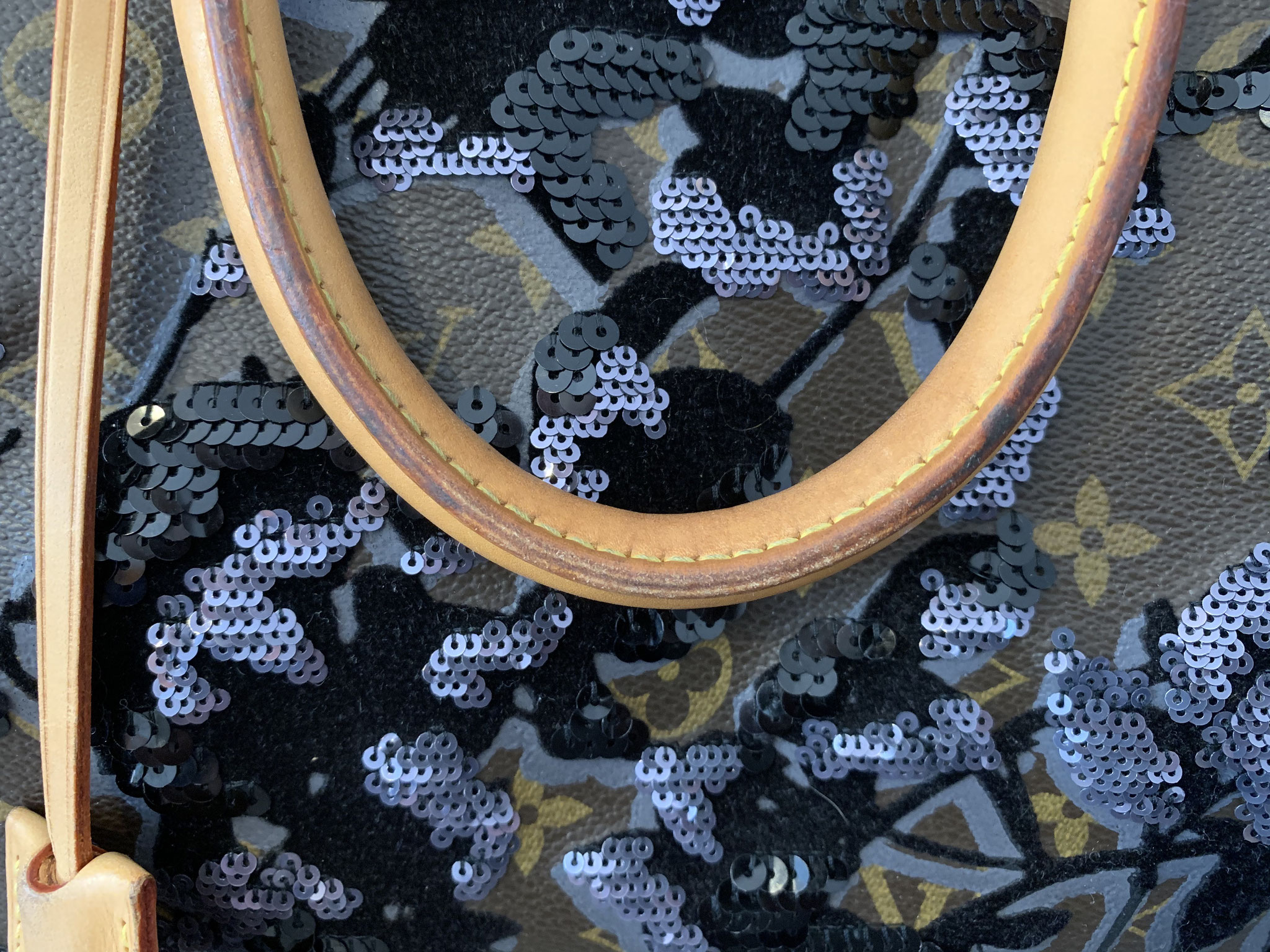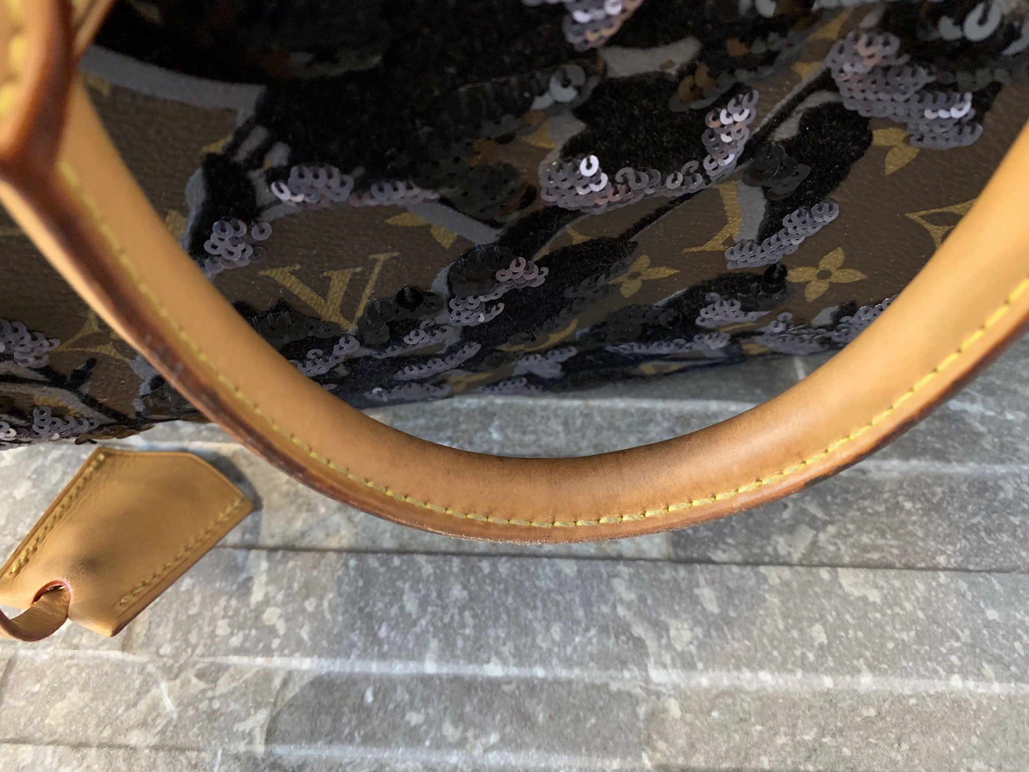 Das Canvas zeigt Abrieb an den Ecken, hier und da fehlen Pailletten oder sind geknickt.