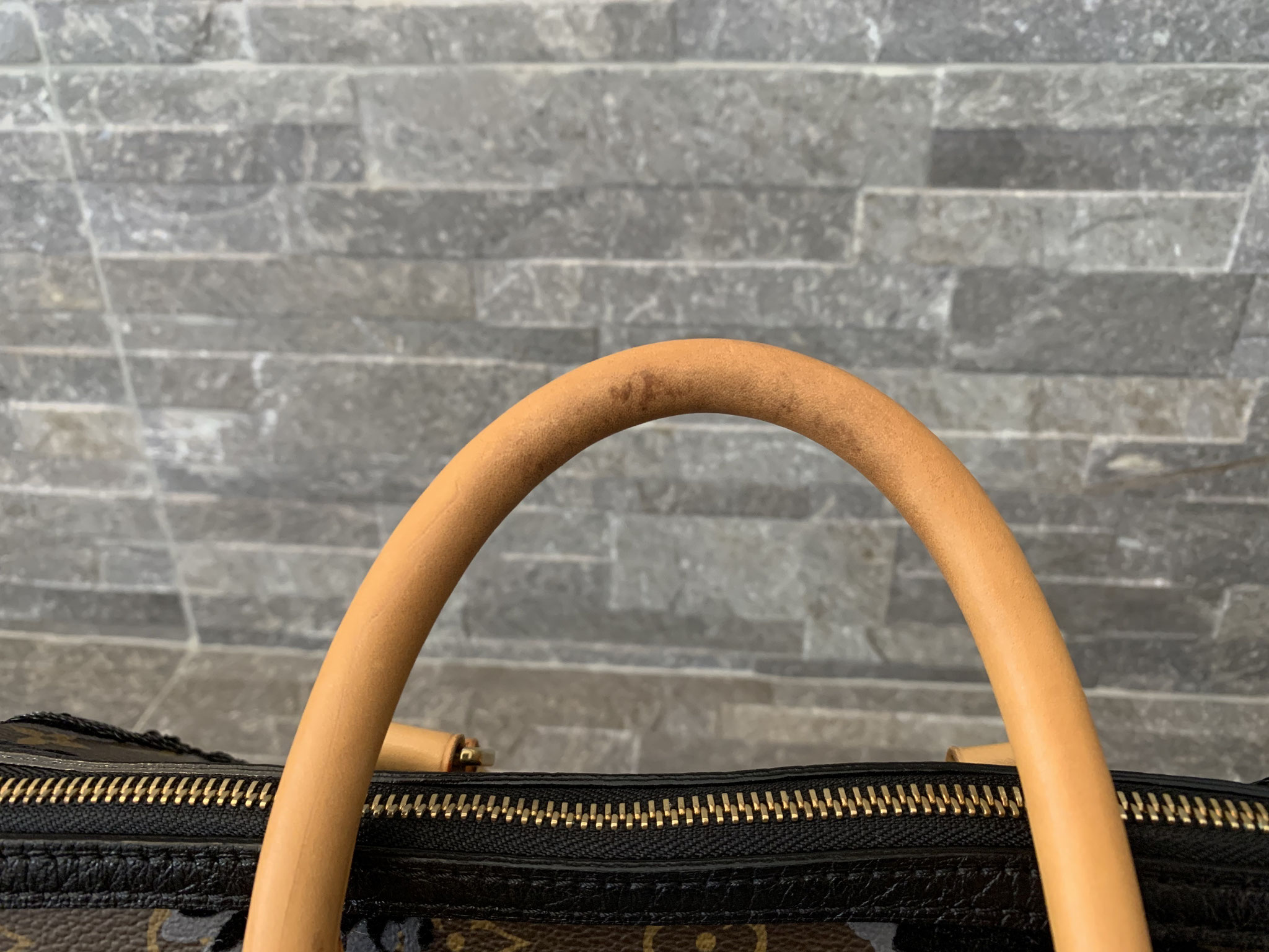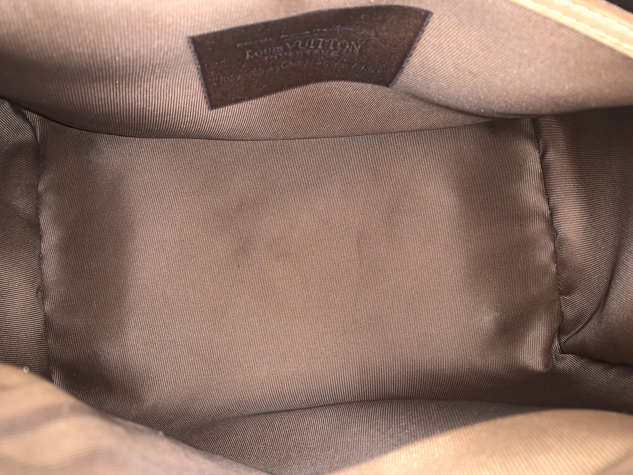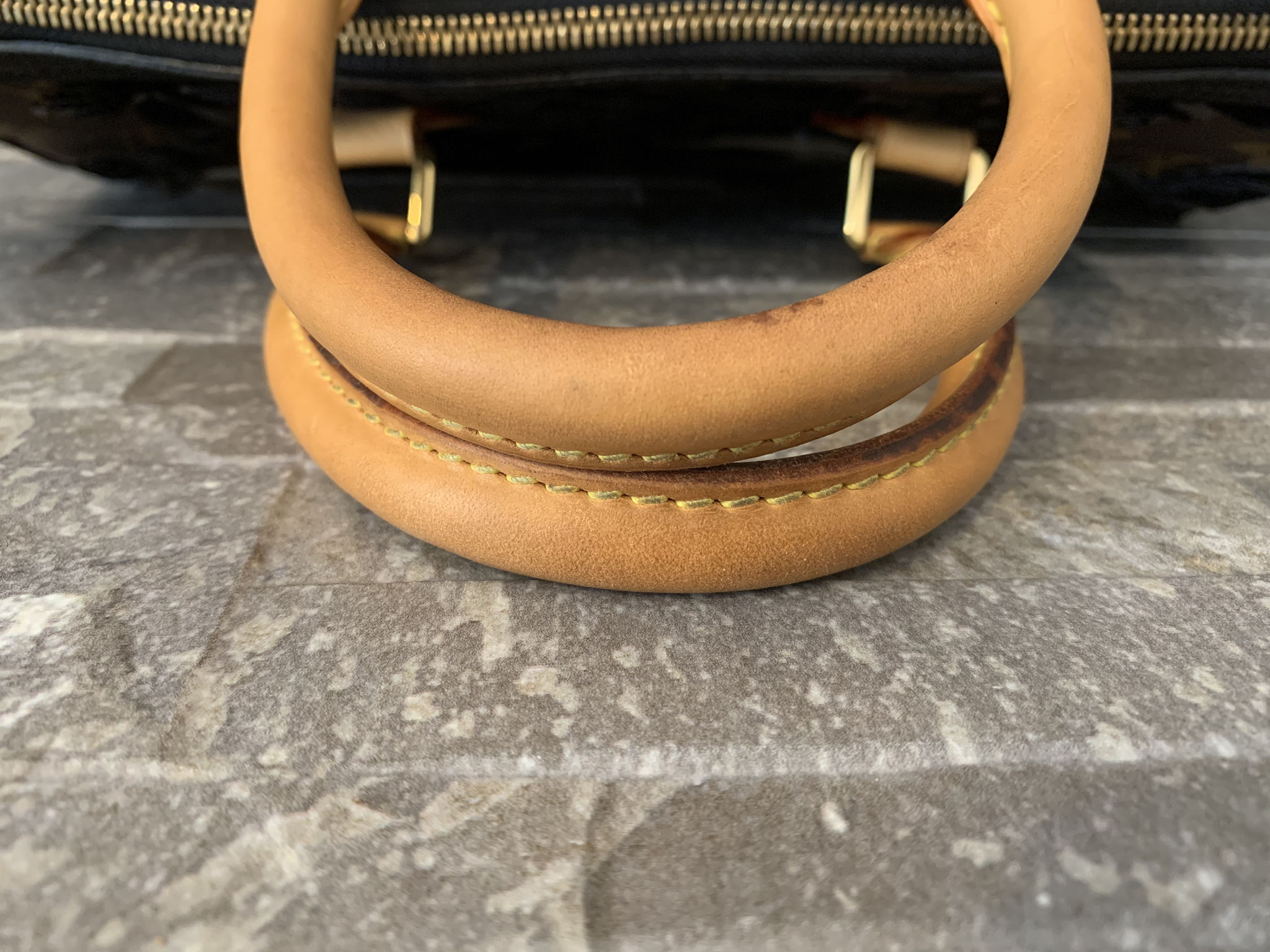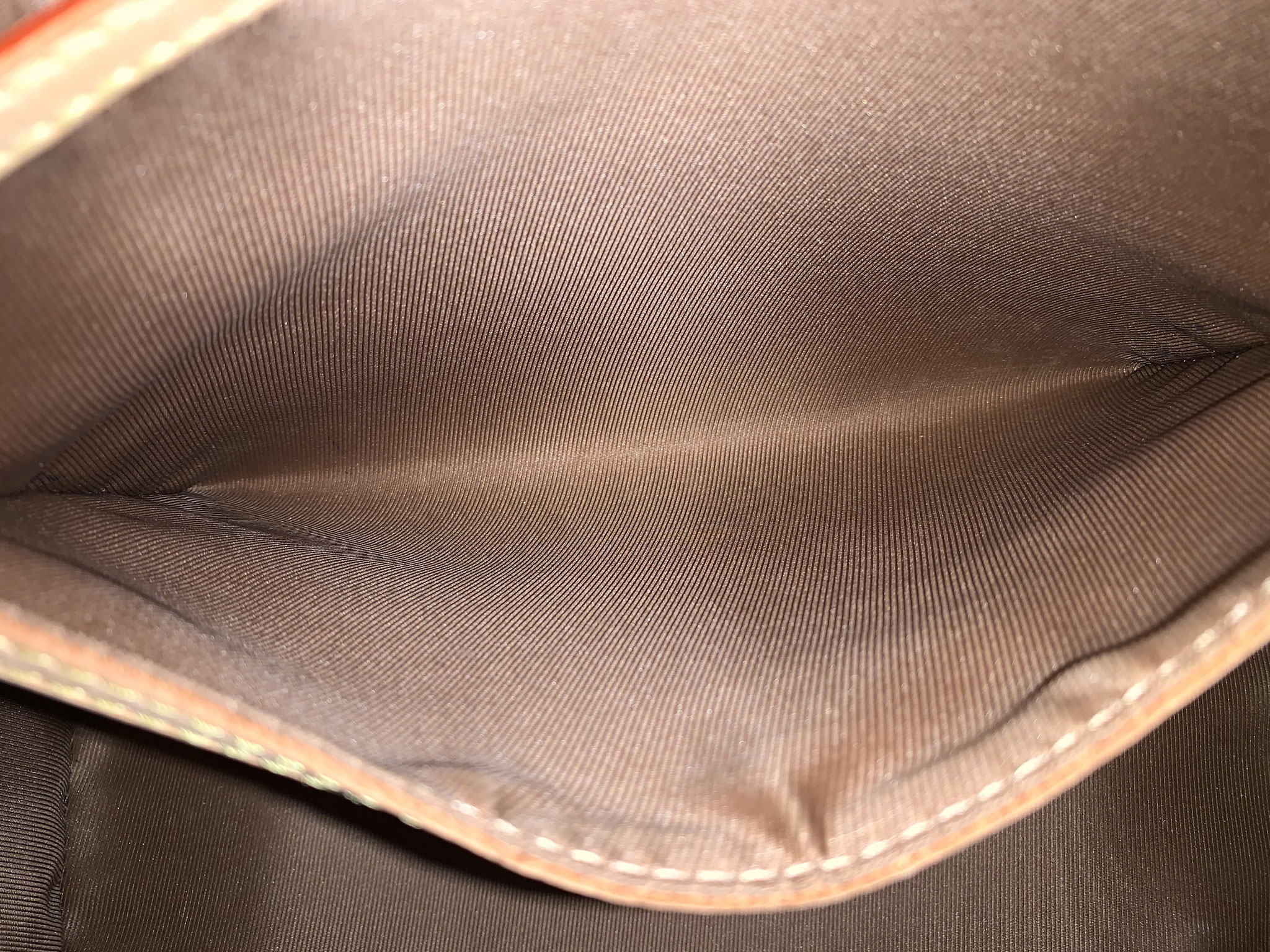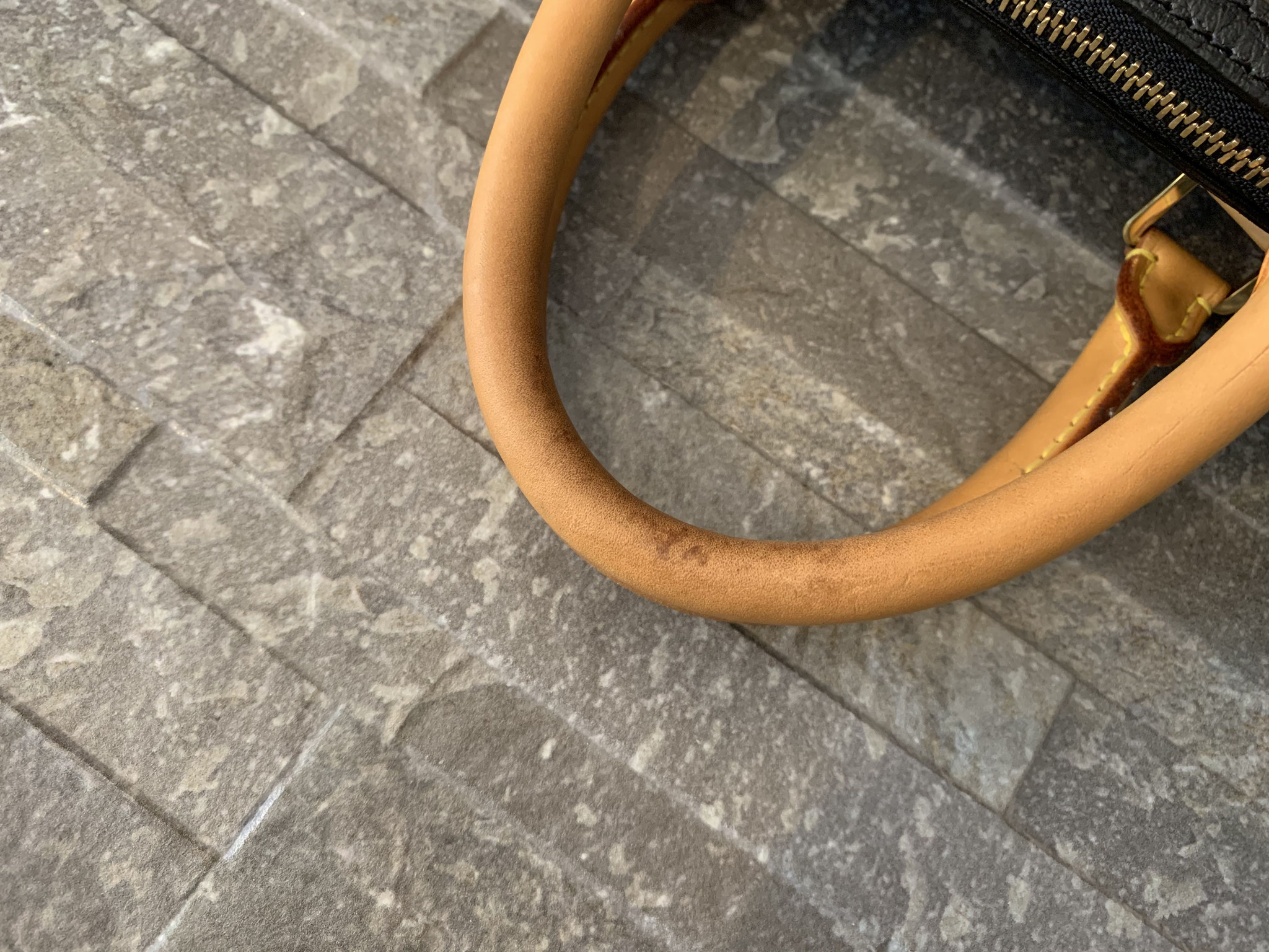 Das VVN-Leder ist bereits patiniert und zeigt Gebrauchsspuren, sowie Verunreinigungen. Insbesondere an den Henkeln. Hier hinterlassen die Pailletten stellenweise Kratzer
