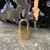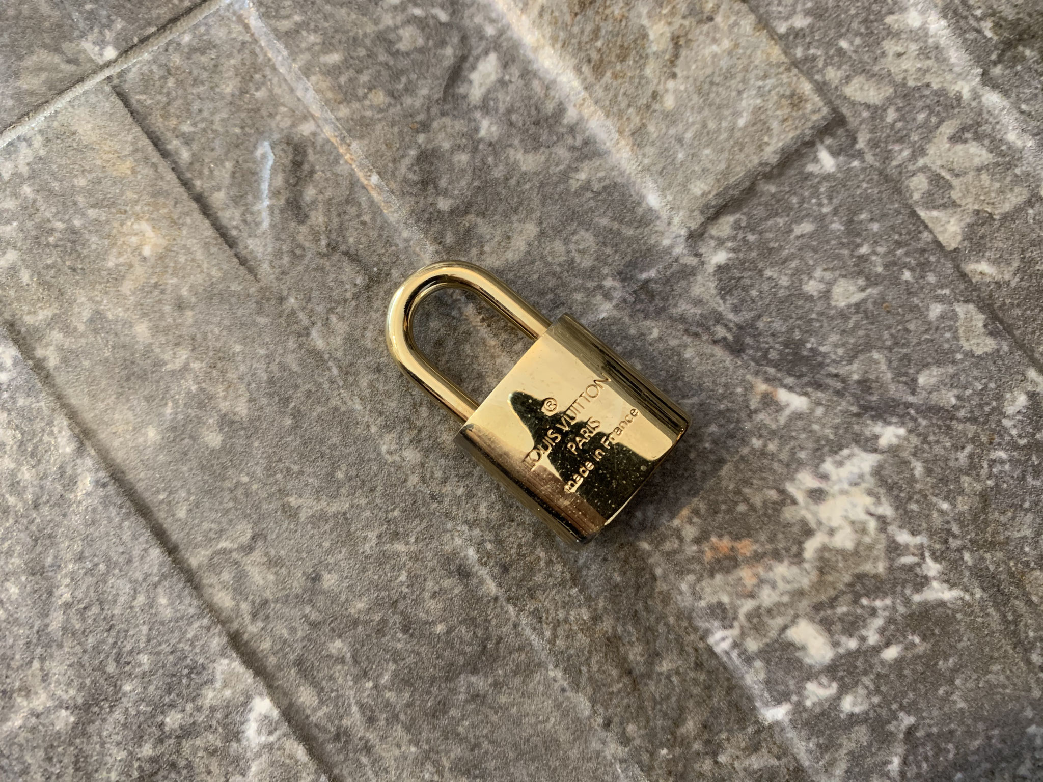 Die goldfarbenen Metallbeschläge weisen Kratzer auf, das Schloss zudem kleine Macken und im Innenraum sind wenige Flecken vorhanden.