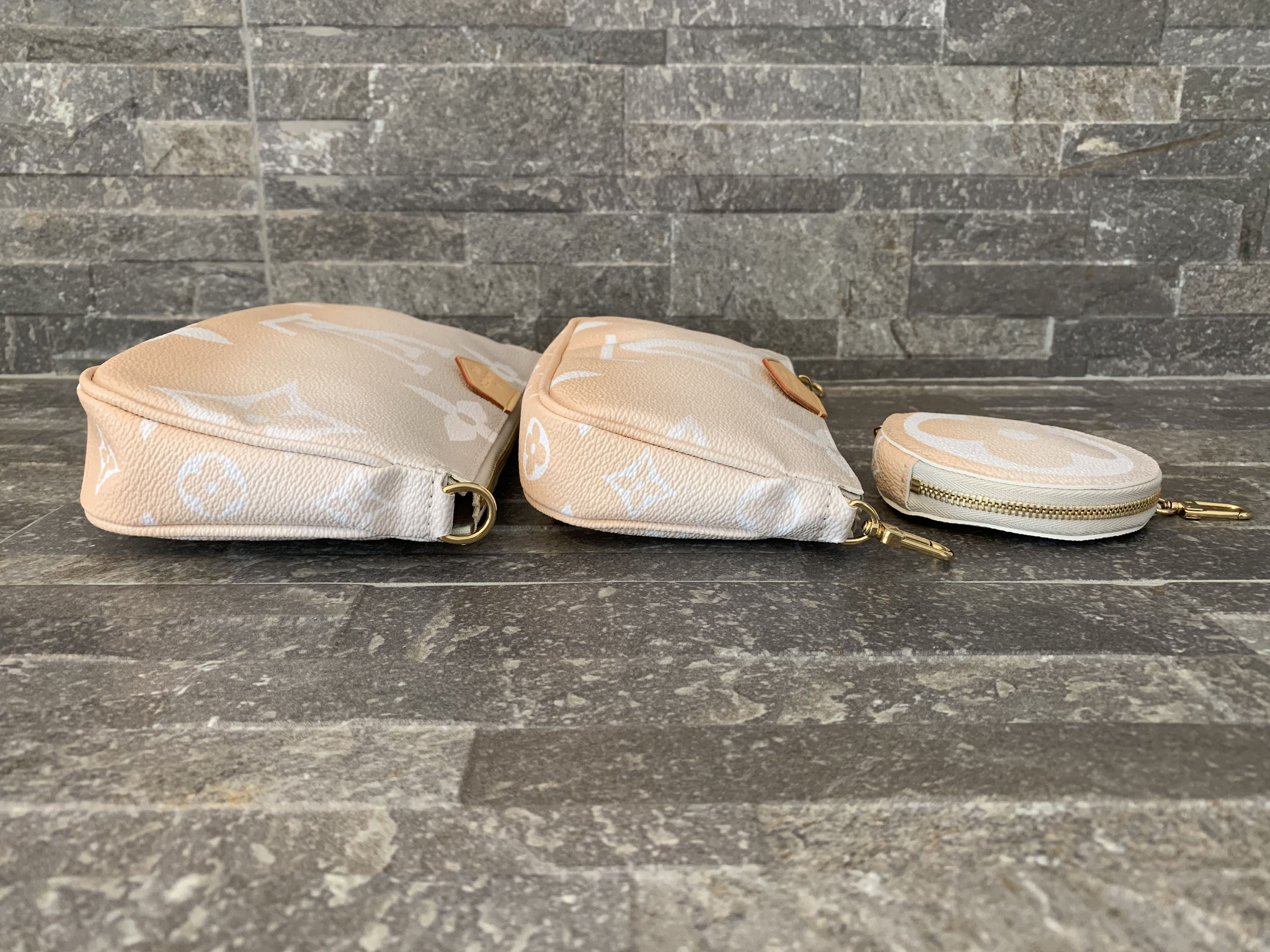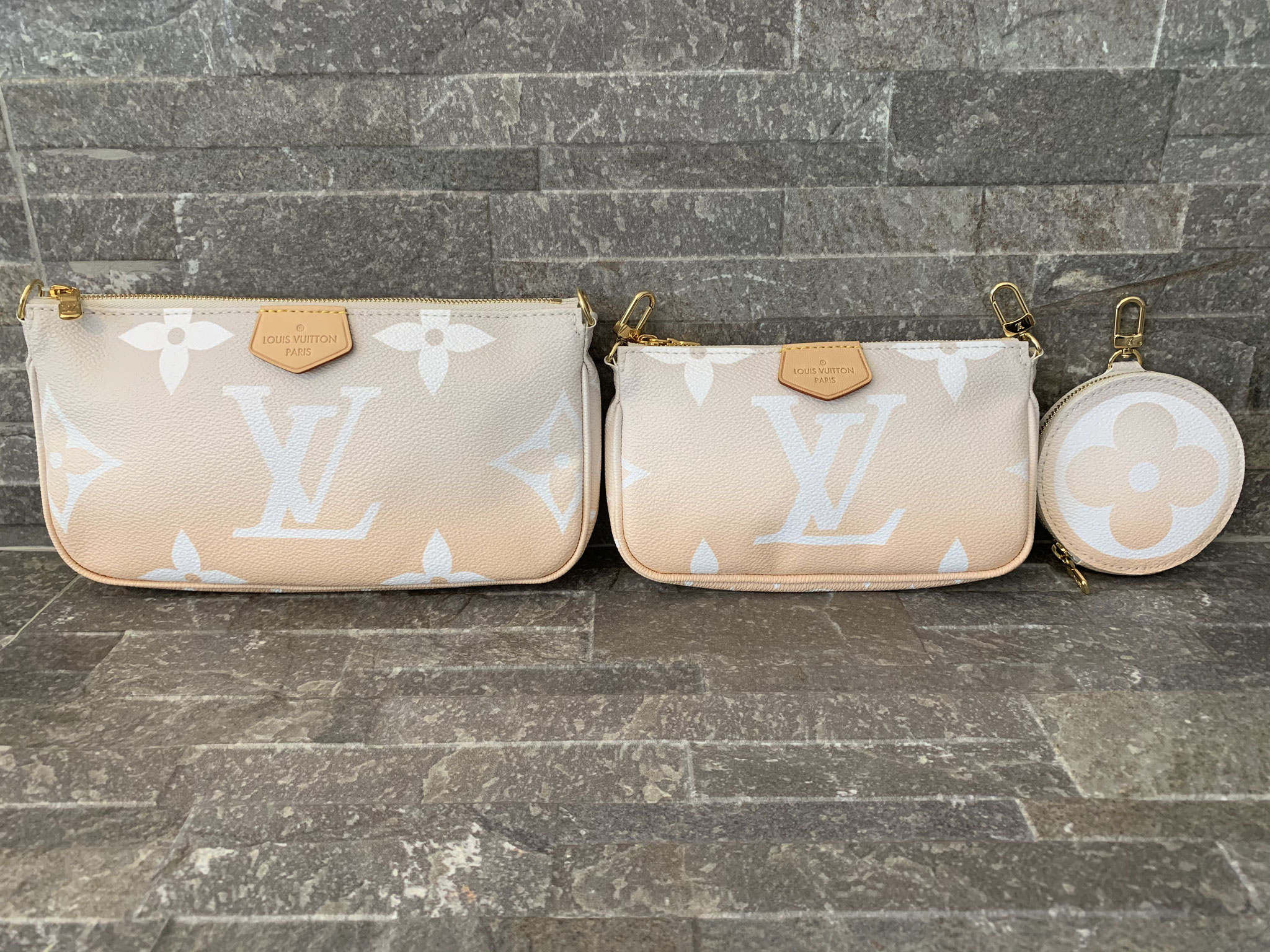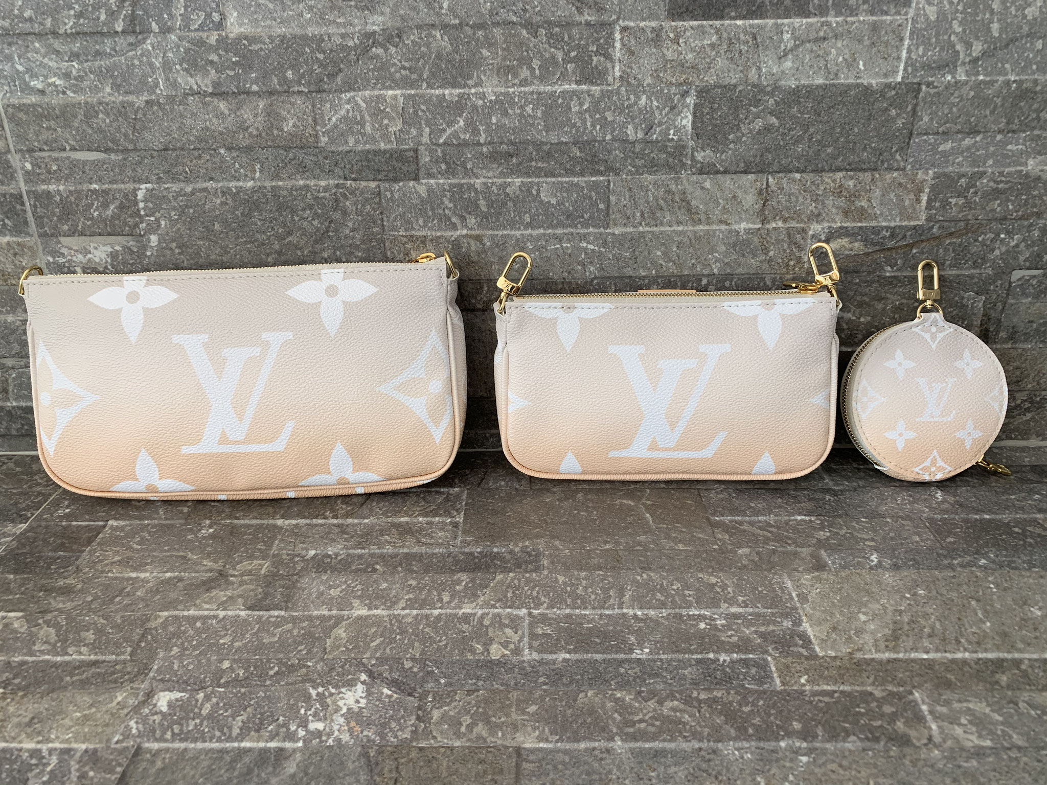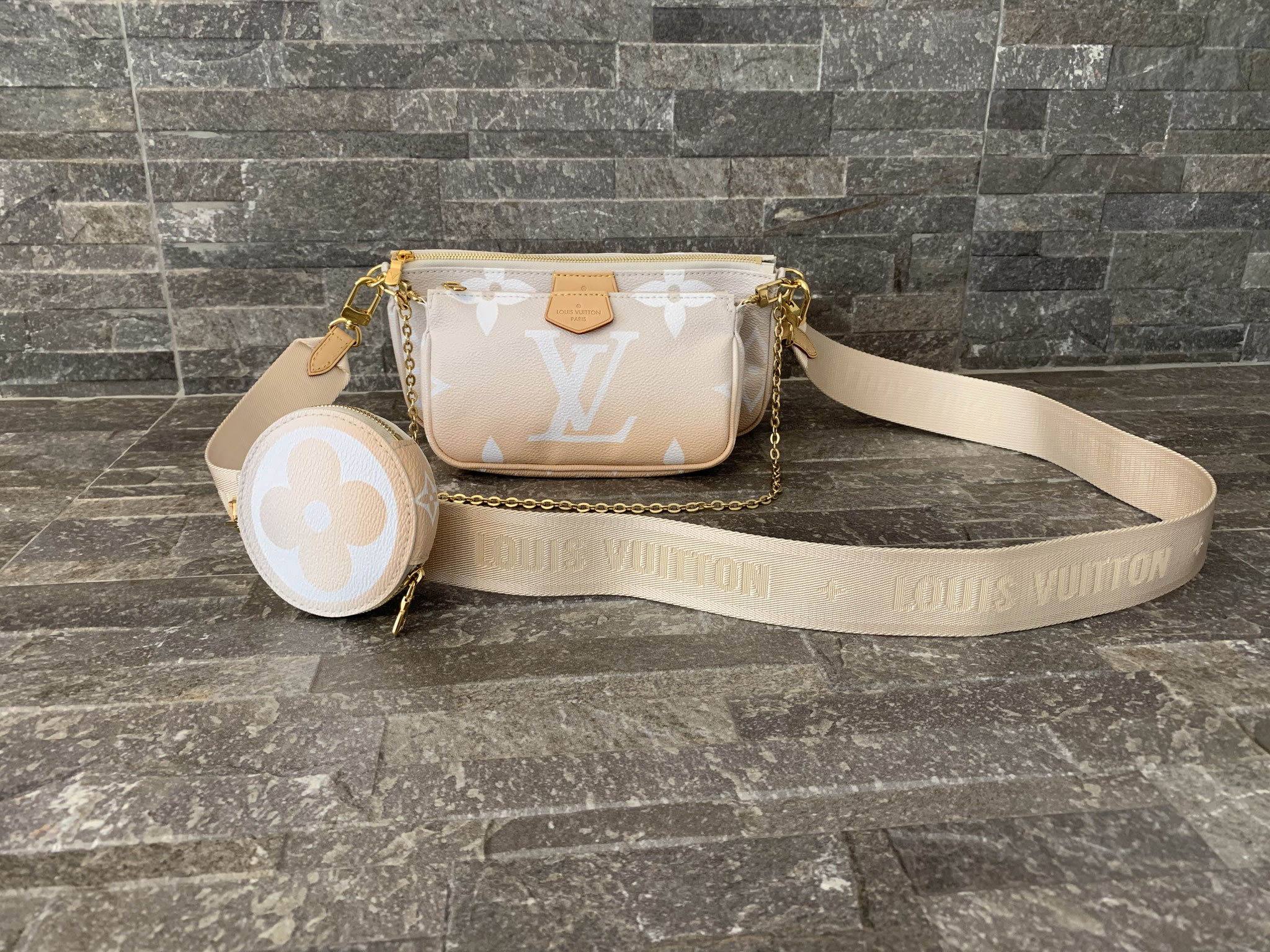Louis Vuitton Monogram By The Pool Multi Pochette Accessoires in Nebelweiß (Pochette Accessoires, Kleine Pochette Accessoires, Round Coin Purse, Jacquard-Schulterriemen, Kette aus goldfarbenem Metall)