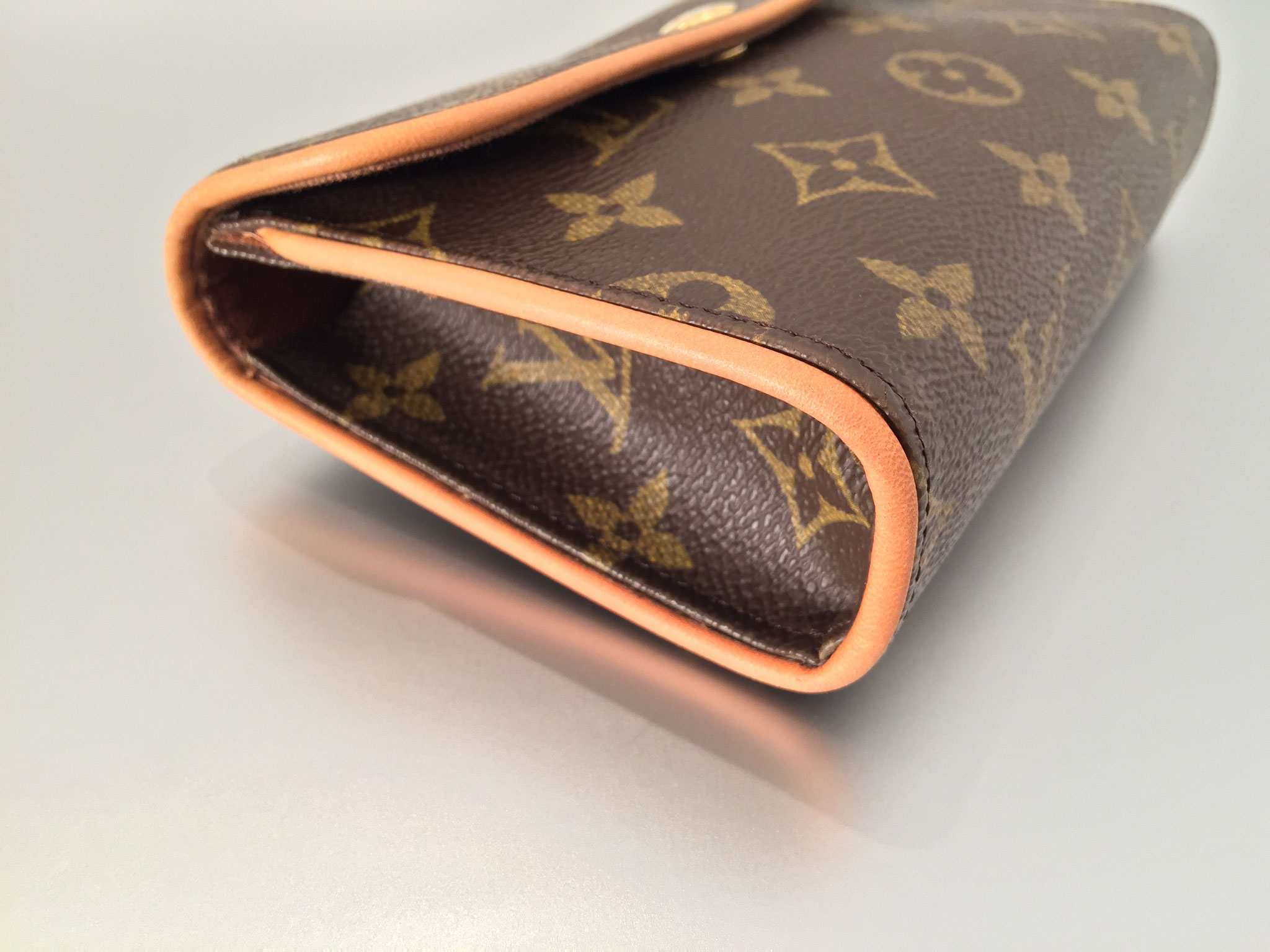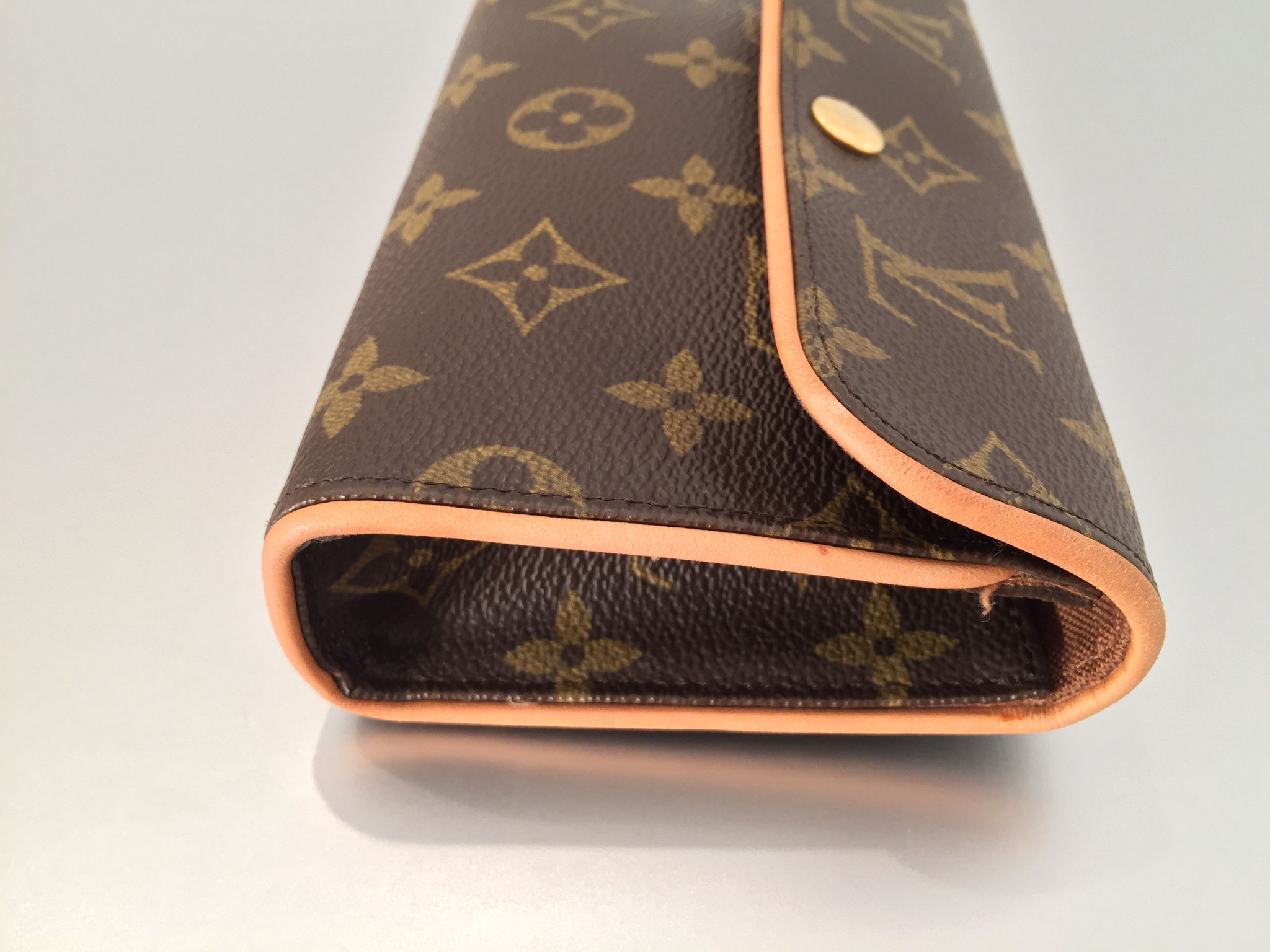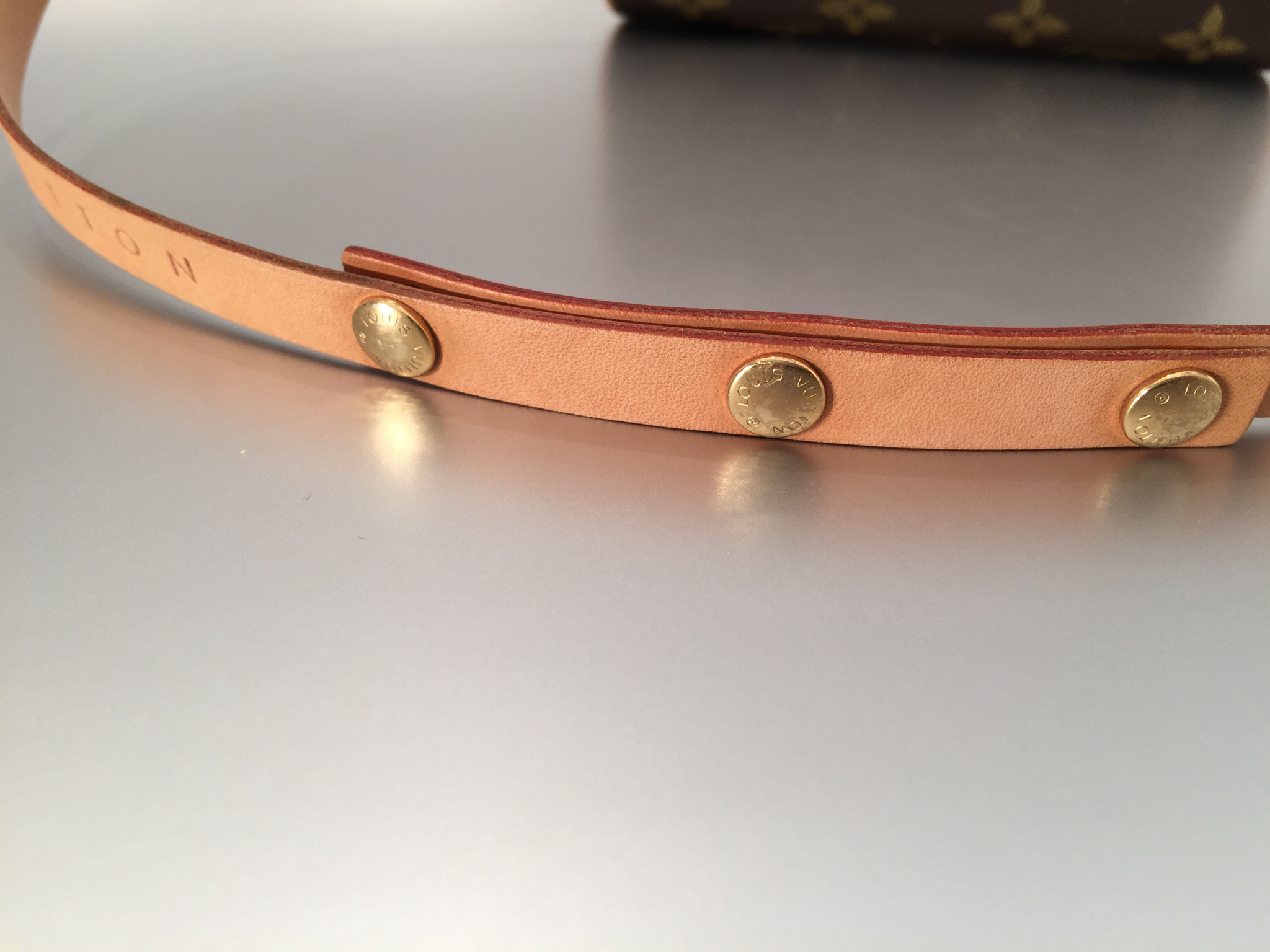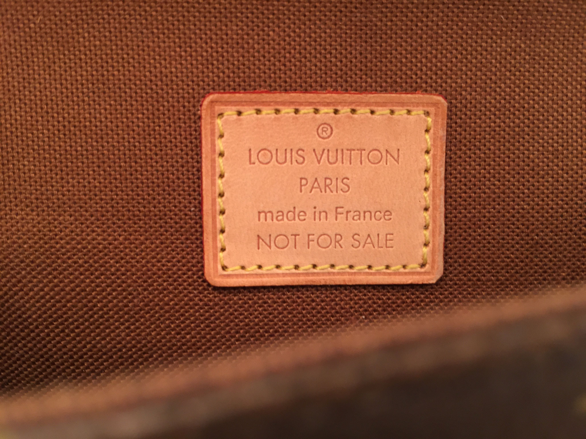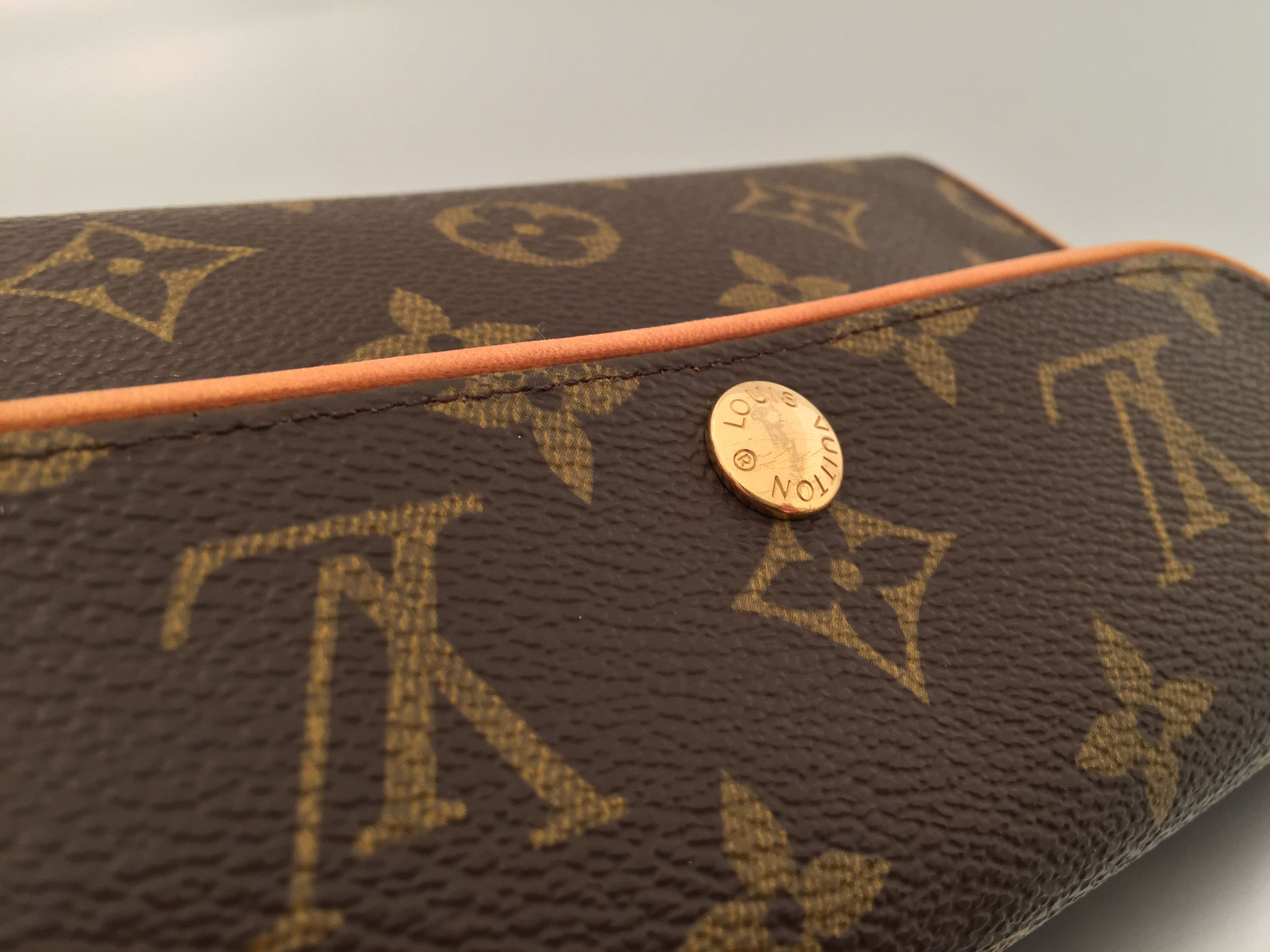 Diese Pochette Florentine gehörte viele Jahre zur offiziellen Uniform der Mitarbeiterinnen im Verkauf. Anders im Gegensatz zur tatsächlich verkauften Pochette Florentine sind der goldene Knopf auf der Außenseite und das braune Textilfutter.