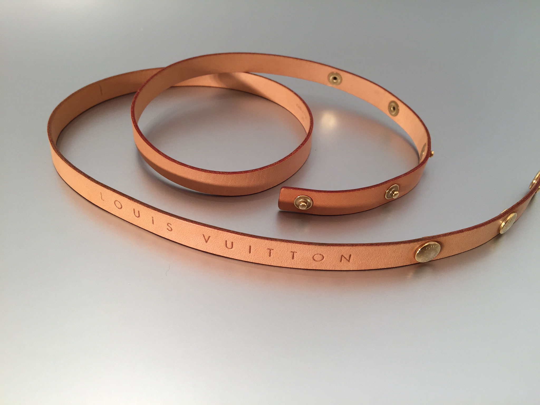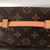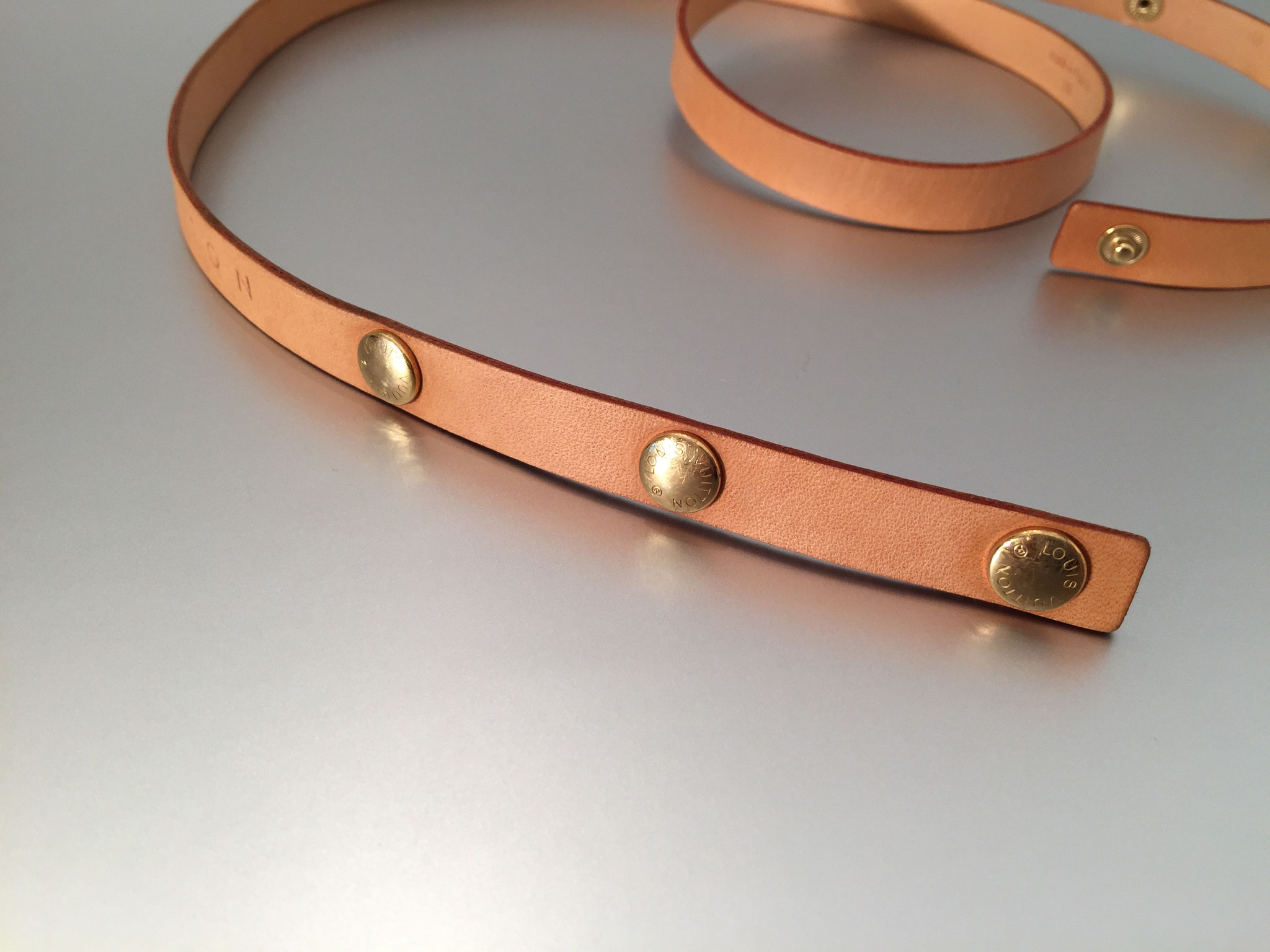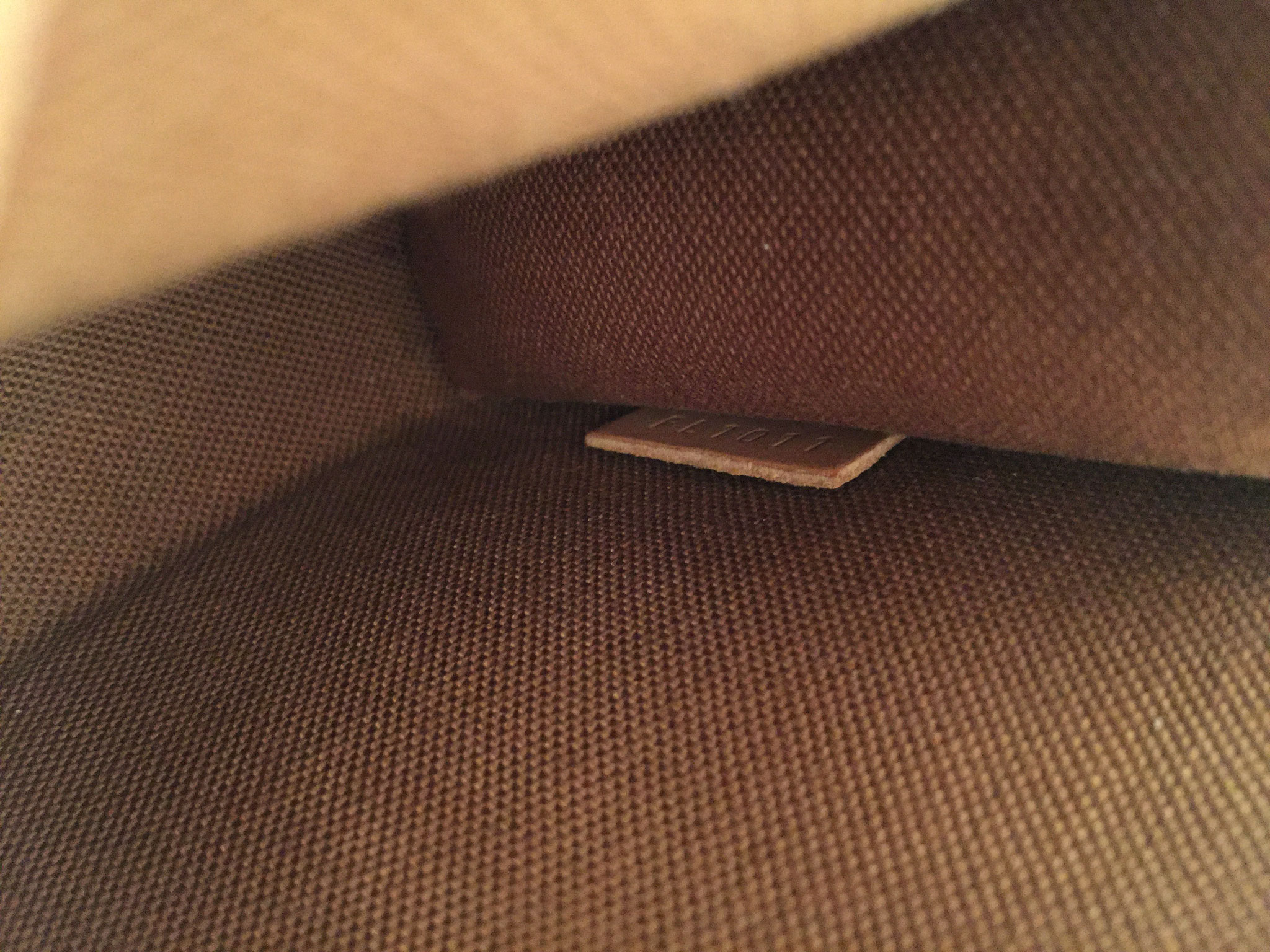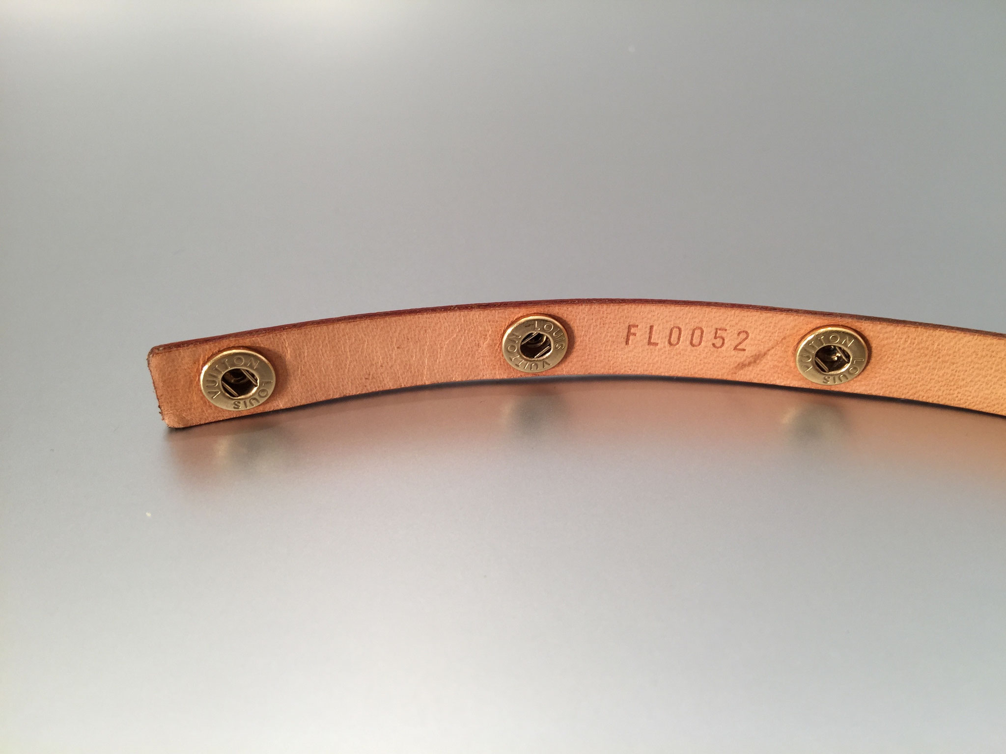 Diese Pochette Florentine gehörte viele Jahre zur offiziellen Uniform der Mitarbeiterinnen im Verkauf. Anders im Gegensatz zur tatsächlich verkauften Pochette Florentine sind der goldene Knopf auf der Außenseite und das braune Textilfutter.